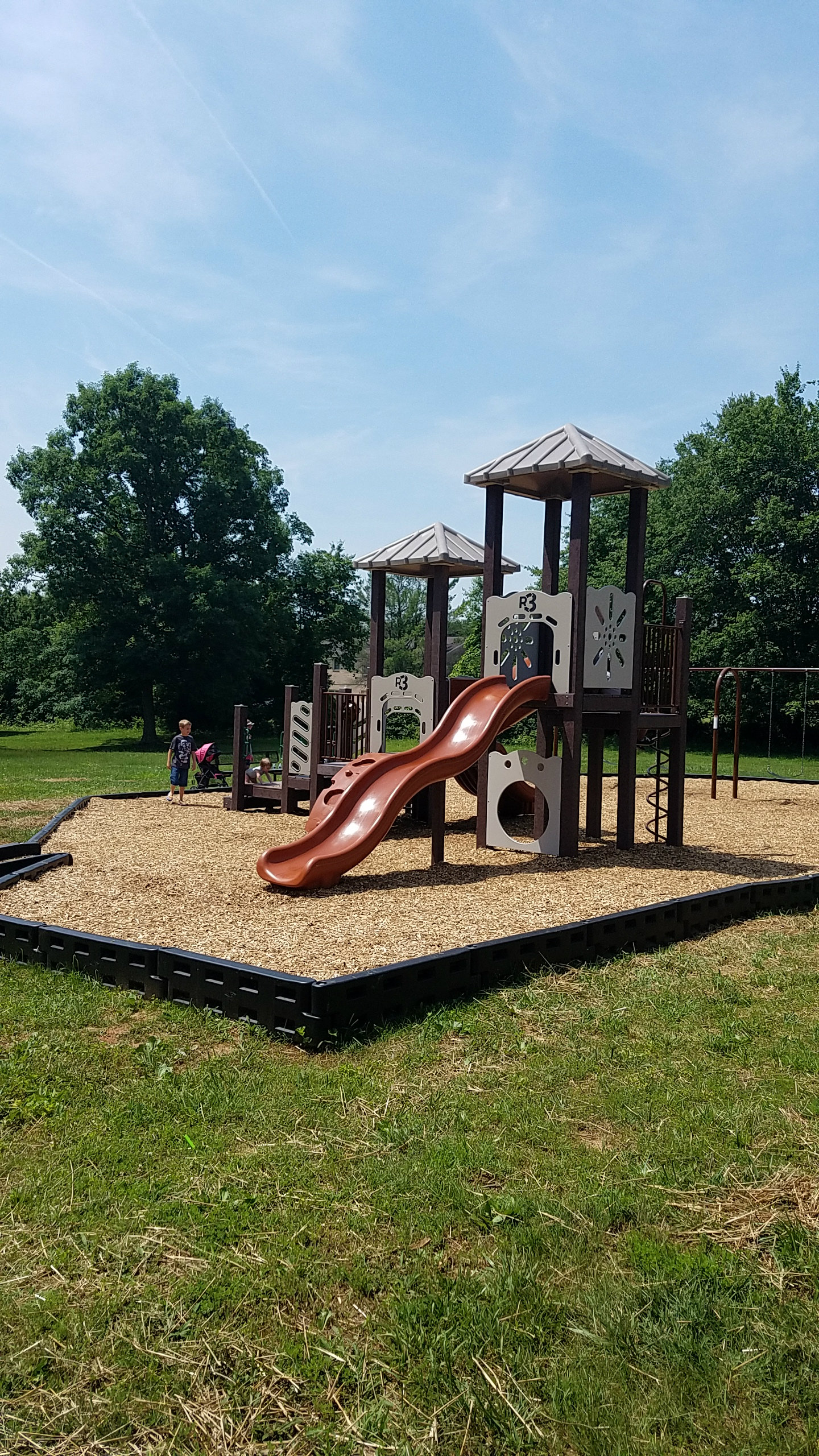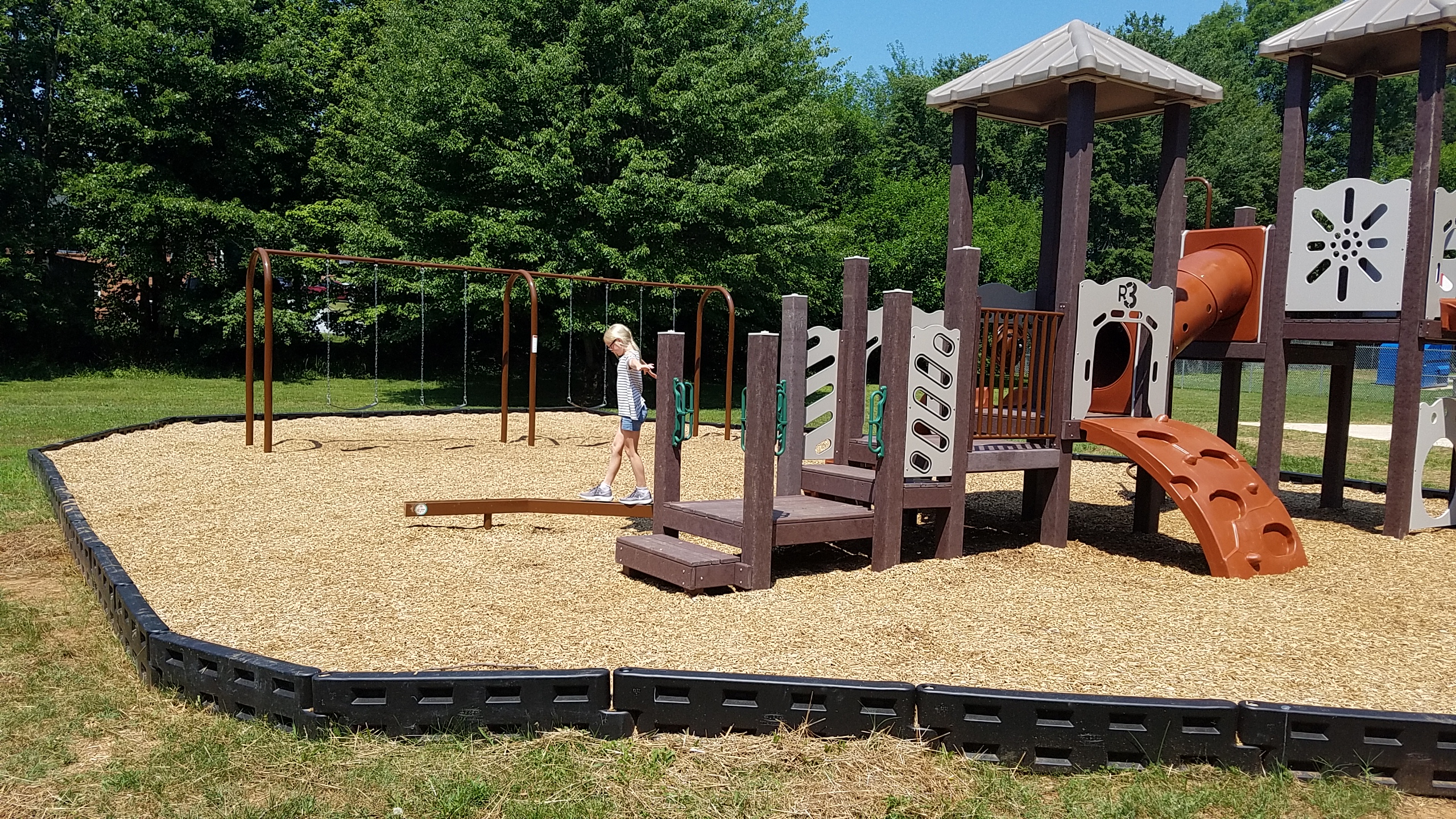 - Play equipment structures with slides, plenty of climbing elements and interactive play panels, a crawl tube and topped with square shingle roofs to help protect children from the sun.